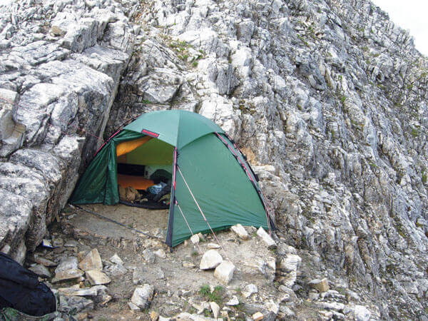 The large amount of water that can accumulate during a short storm is the biggest risk for tents and can cause even more damage than lightning itself. In hollows, tents are submerged from below, whilst in dried-out streambeds, you can run into torrents of water. Rivers can rise and flood the area. This is reinforced by the fact that sluice gates are opened upstream due to heavy rains and the amount of water in a valley drastically increases. Due to the large amounts of water, it is also extremely dangerous near rock faces, as individual rocks can fall from a cliff face, resulting in even larger quantities of rock falling. In the worst case scenario, this could result in a landslide or a debris avalanche. In sum, it’s very important to determine where the water could come from and where it will flow to.