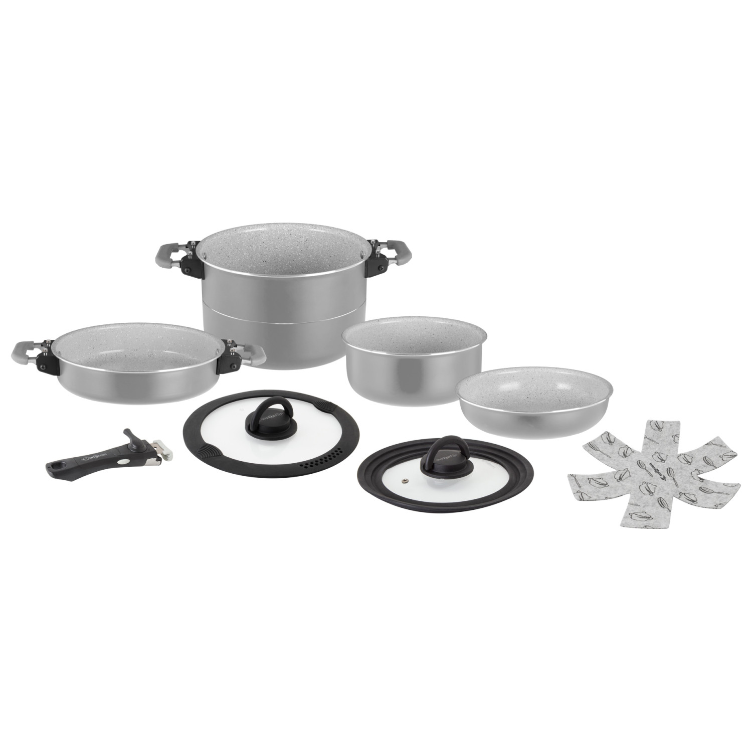 - one large saucepan (22 cm, 4.9L); one small saucepan (18 cm, 1.7L); one large frying pan (22 cm, 1.5L); one small frying pan (20 cm, 1.2L); two lids; one handle