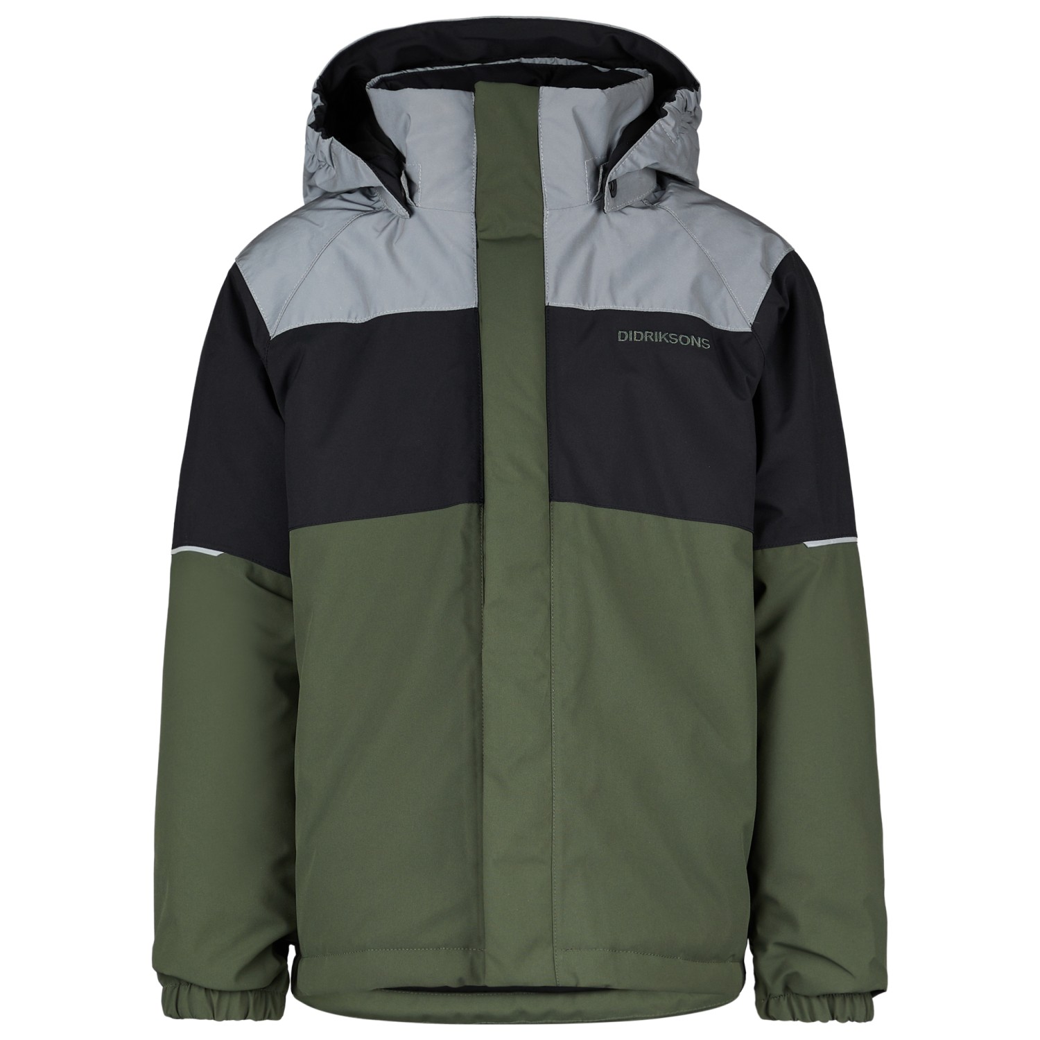 - elastic sleeve cuffs, elastic inner cuffs, reflective details, stand up collar, drop back hem, adjustable hem