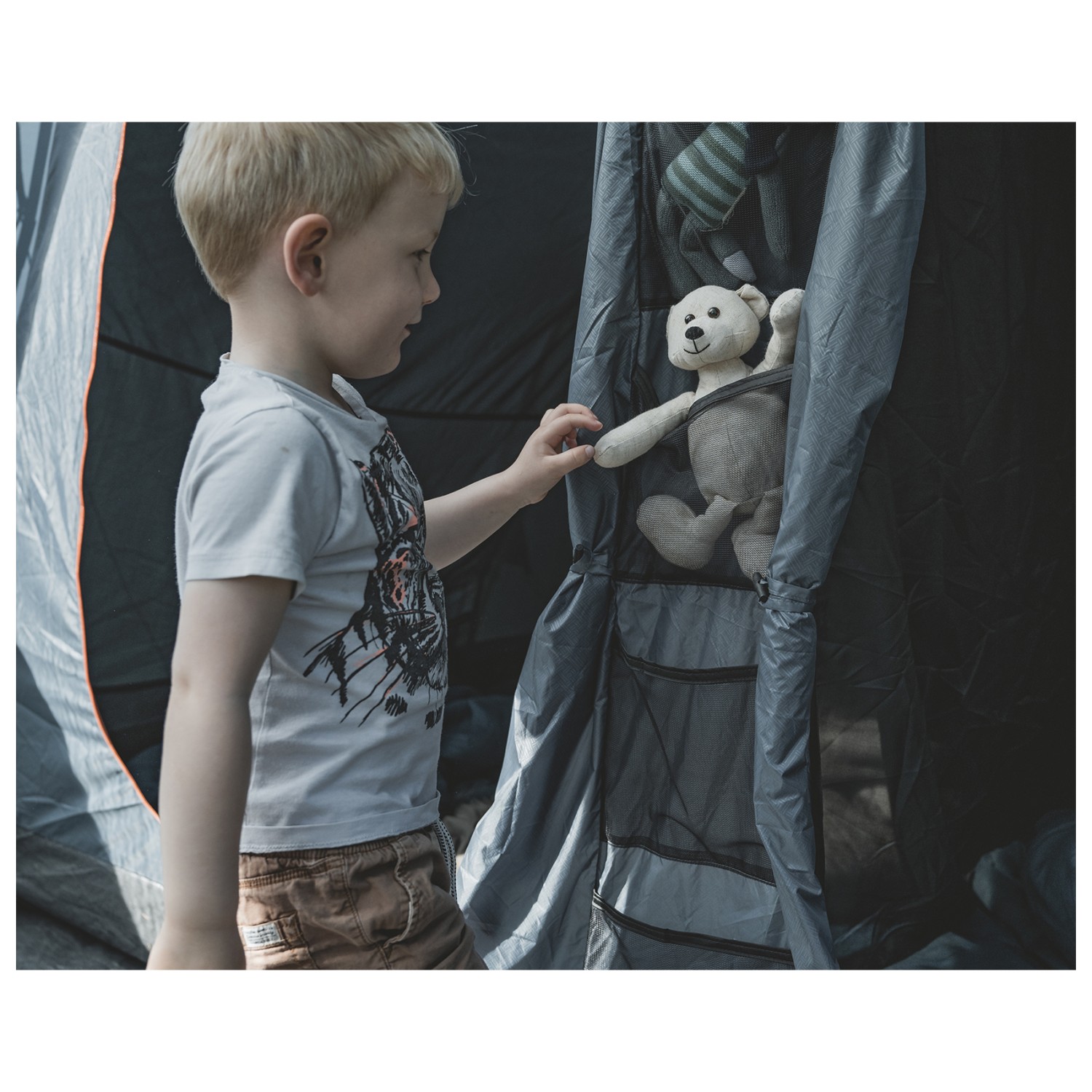The tent itself is wind and weatherproof. While rainy days on the campsite are no fun in any case, at least you don't have to worry about getting wet. In addition, the tunnel tent can and must be secured with several guy lines and is therefore secure even in windy conditions.