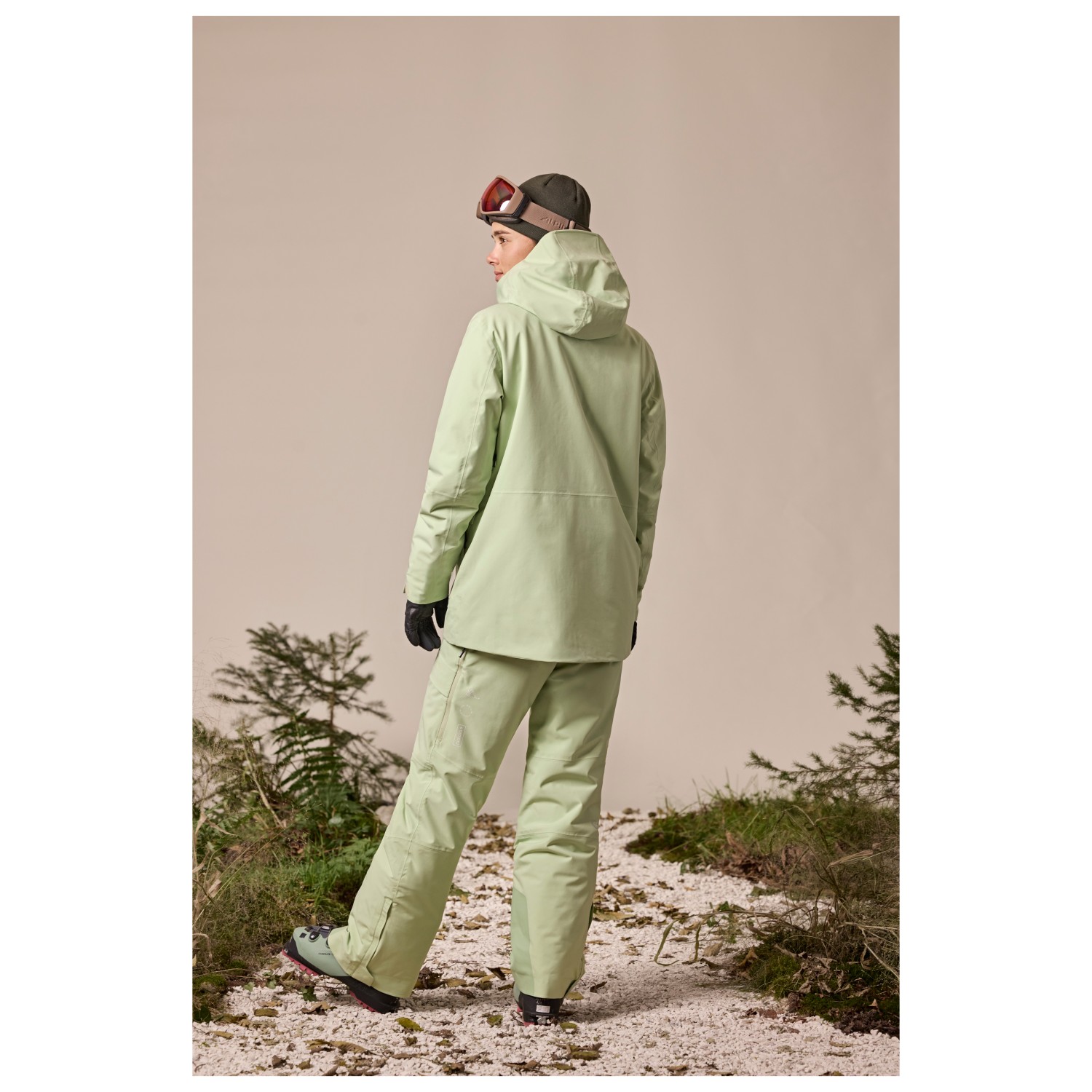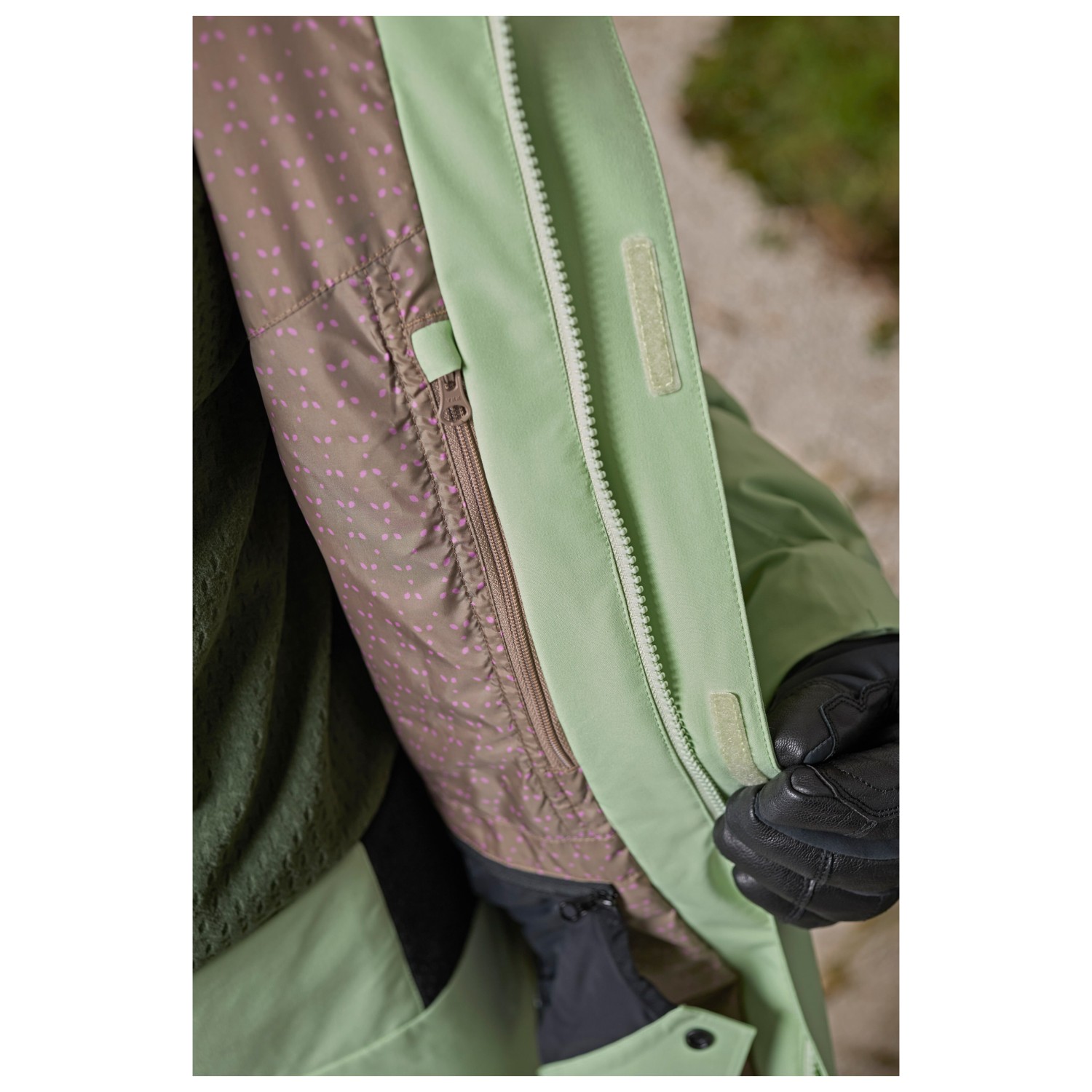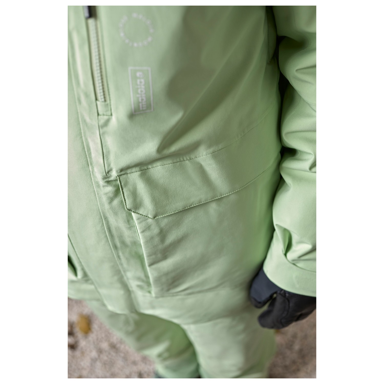 - hook-and-loop fasteners on the sleeves, drawstring in the seam, reflective details, powder skirt
