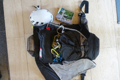 - valuables pocket, 2 side mesh compartments, trekking pole attachment, front compartment, hip belt pocket, integrated helmet net, map compartment, key clip