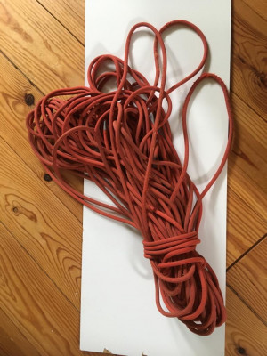 We used it to climb some trad routes They were just simple, ordinary routes, and we did not make any falls in the rope. Nor did we have a in any way a deviant descent or something like that. Still, after 4 climbs (on granite and gneiss), we were stunned to see that one of the ropes, the red one, had deteriorated in a bad way on several distinct places. We had abseiled only once the days before, for 20m in granite, ropes through a good standard metal abseil ring, no problems in pulling the ropes down. After that moment, we abseiled 2 longer pitches in gneiss.