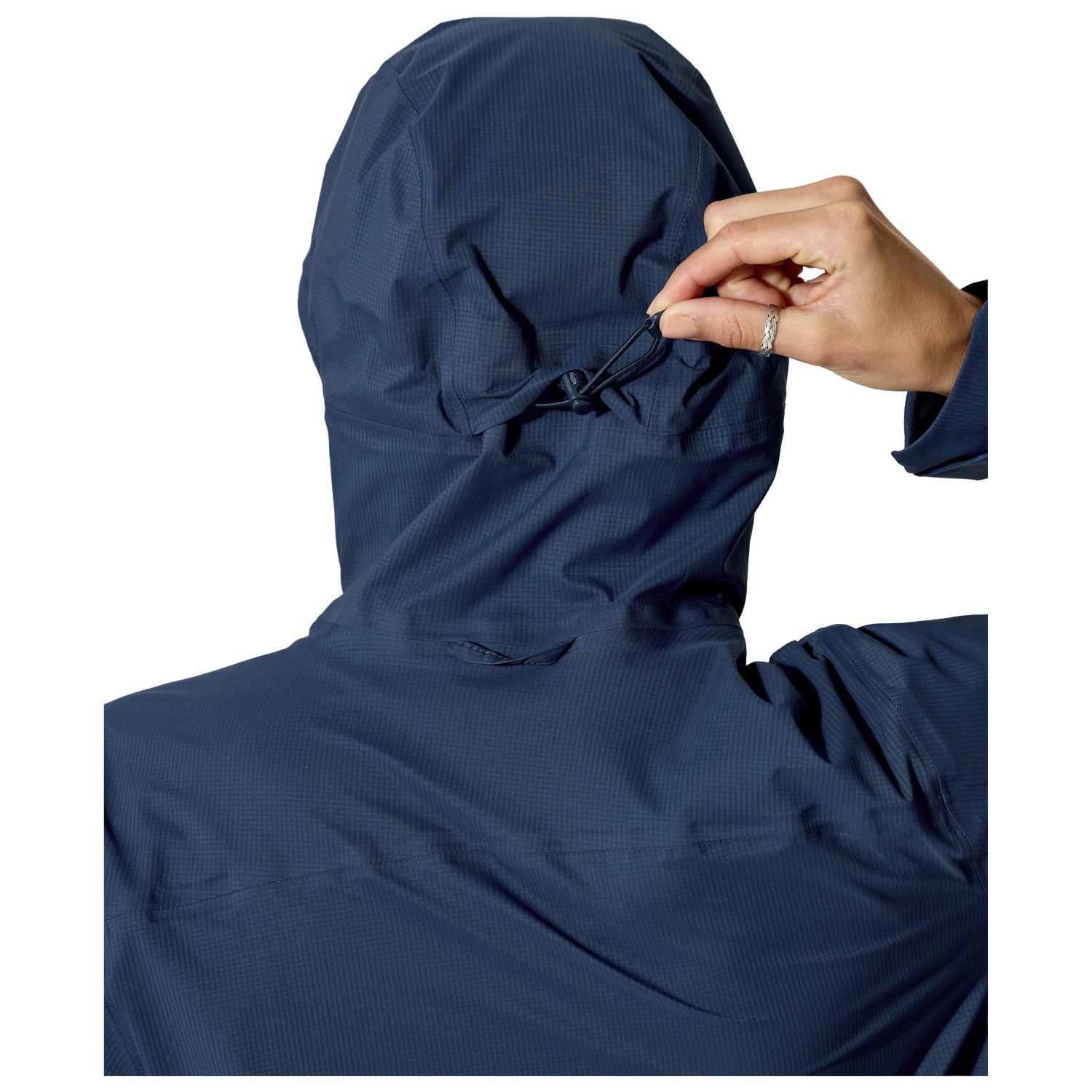 - stowable in the collar, with drawstring, with peak, adjustable