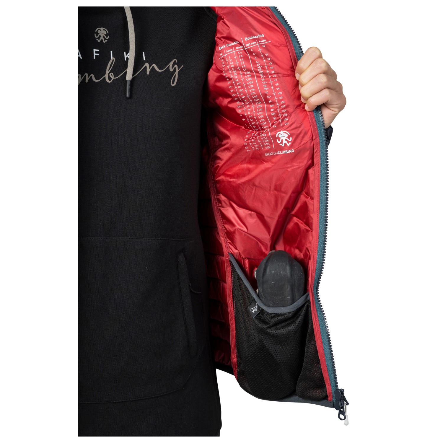 - 1 zipped chest pocket, 2 mesh inside pockets, 2 zipped front pockets