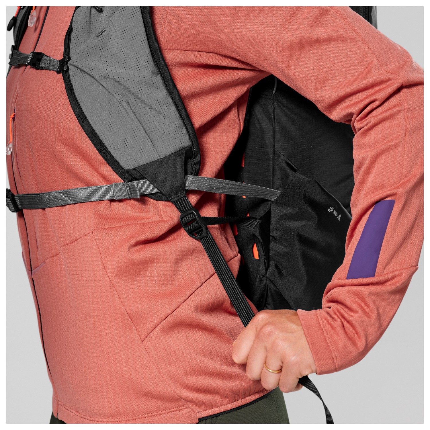 - ice axe/pole holder, bottle holder, front compartment, inside compartment, key clip, pocket on the shoulder strap, valuables pocket