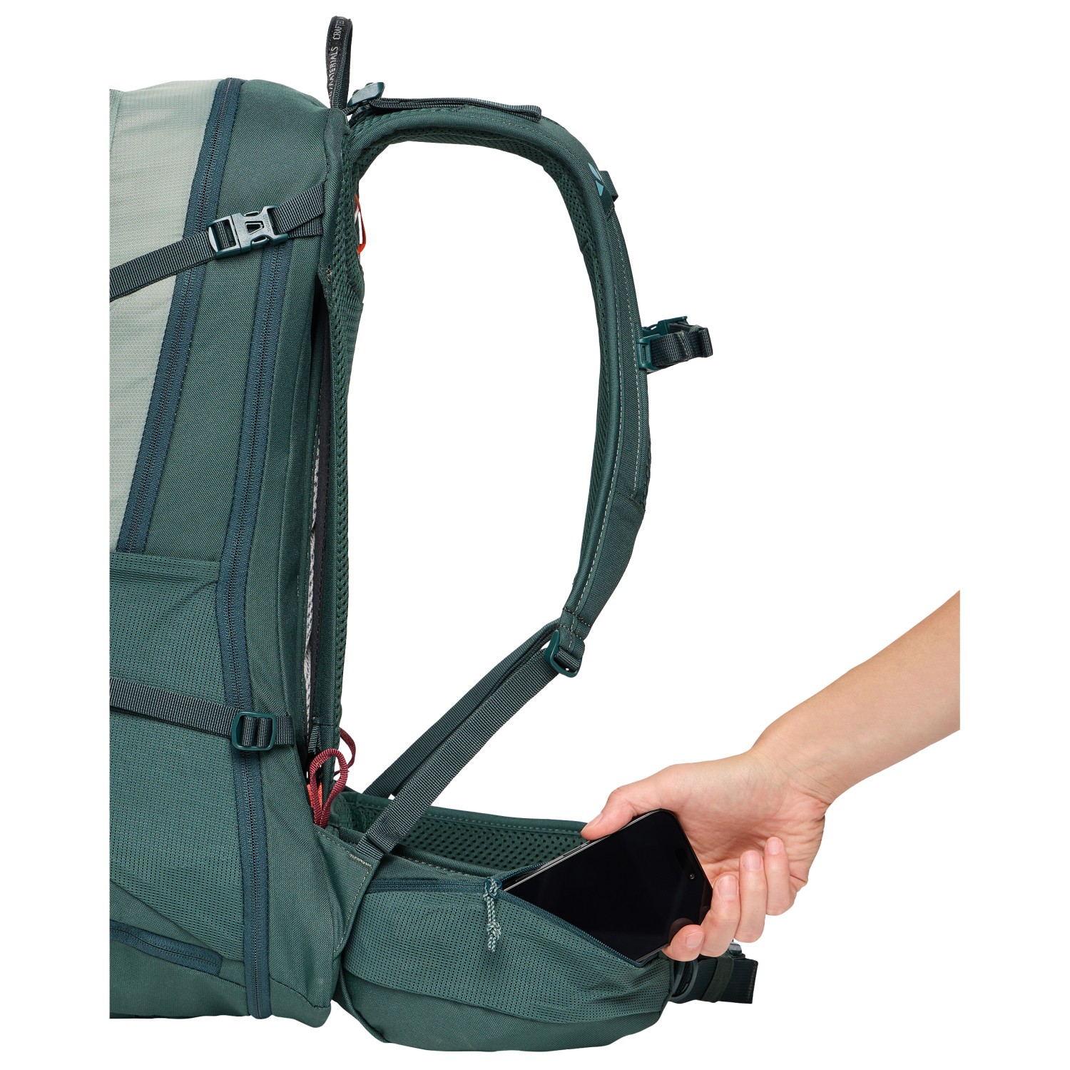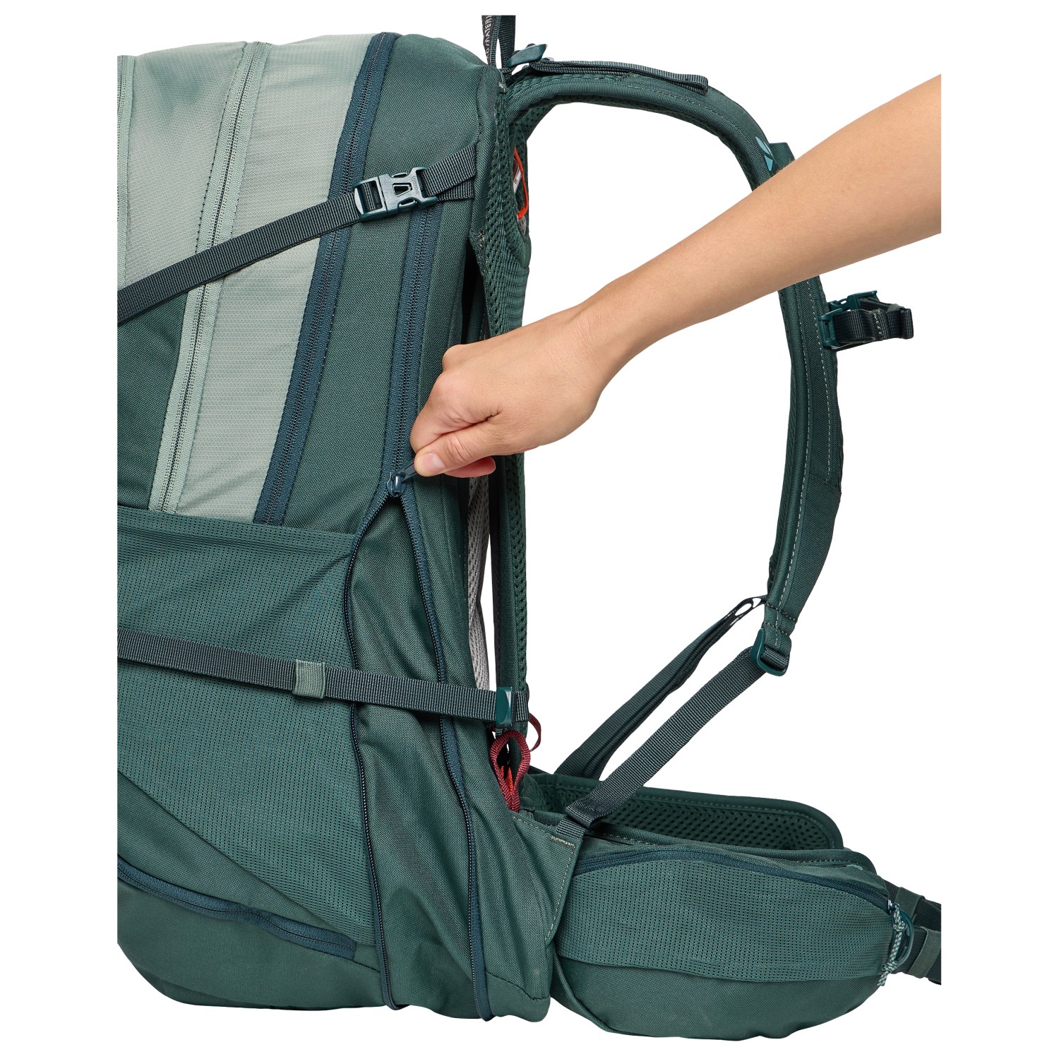 - glasses holder, bottom compartment, hip belt pocket, internal organiser compartment, trekking pole attachment, front zip pocket, 2 side compartments